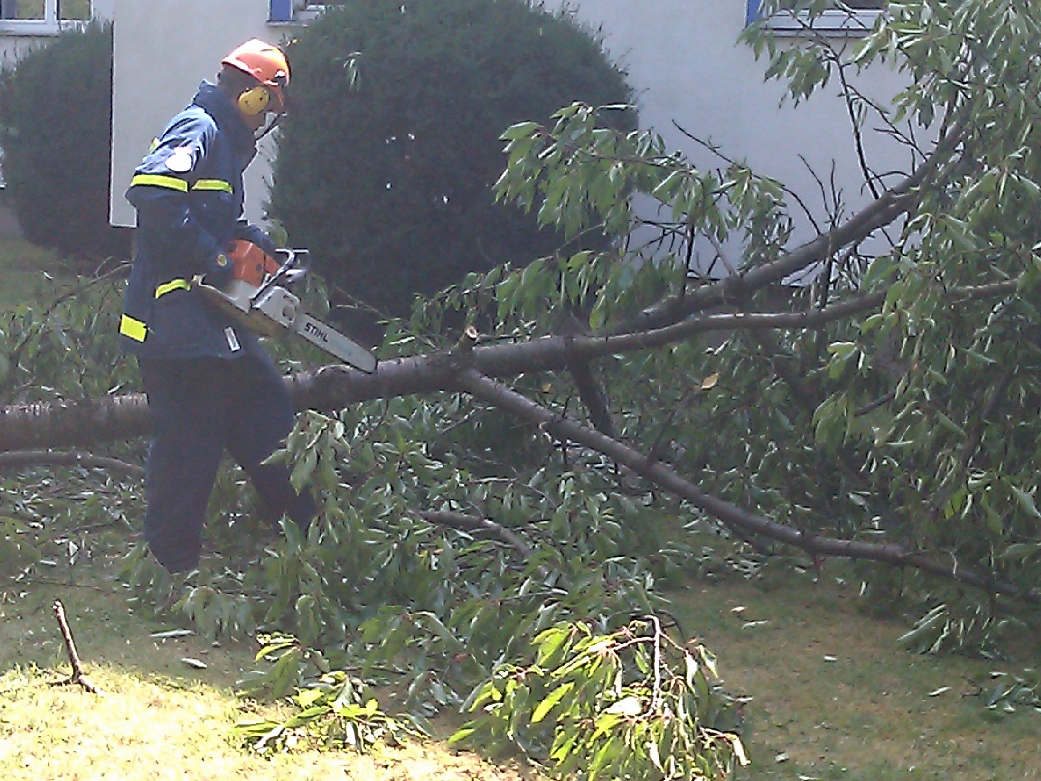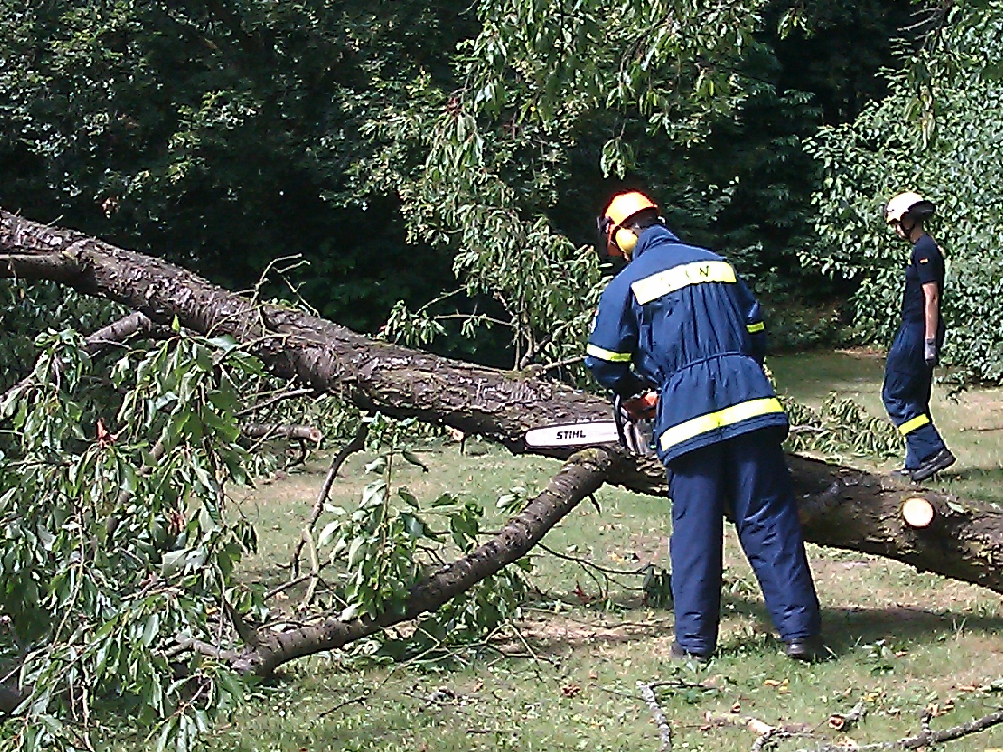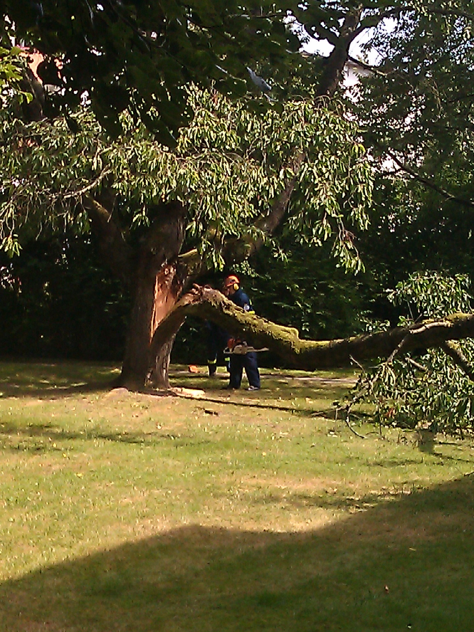 „Ast auf Gehweg“: hier versperrte ein großer Ast, der in der Nacht abgebrochen war den sicheren Zugang zu einem Hauseingang und einem Spielplatz. Der Baum wurde mittels Ketten- und Bügelsäge zerlegt und beseitigt.