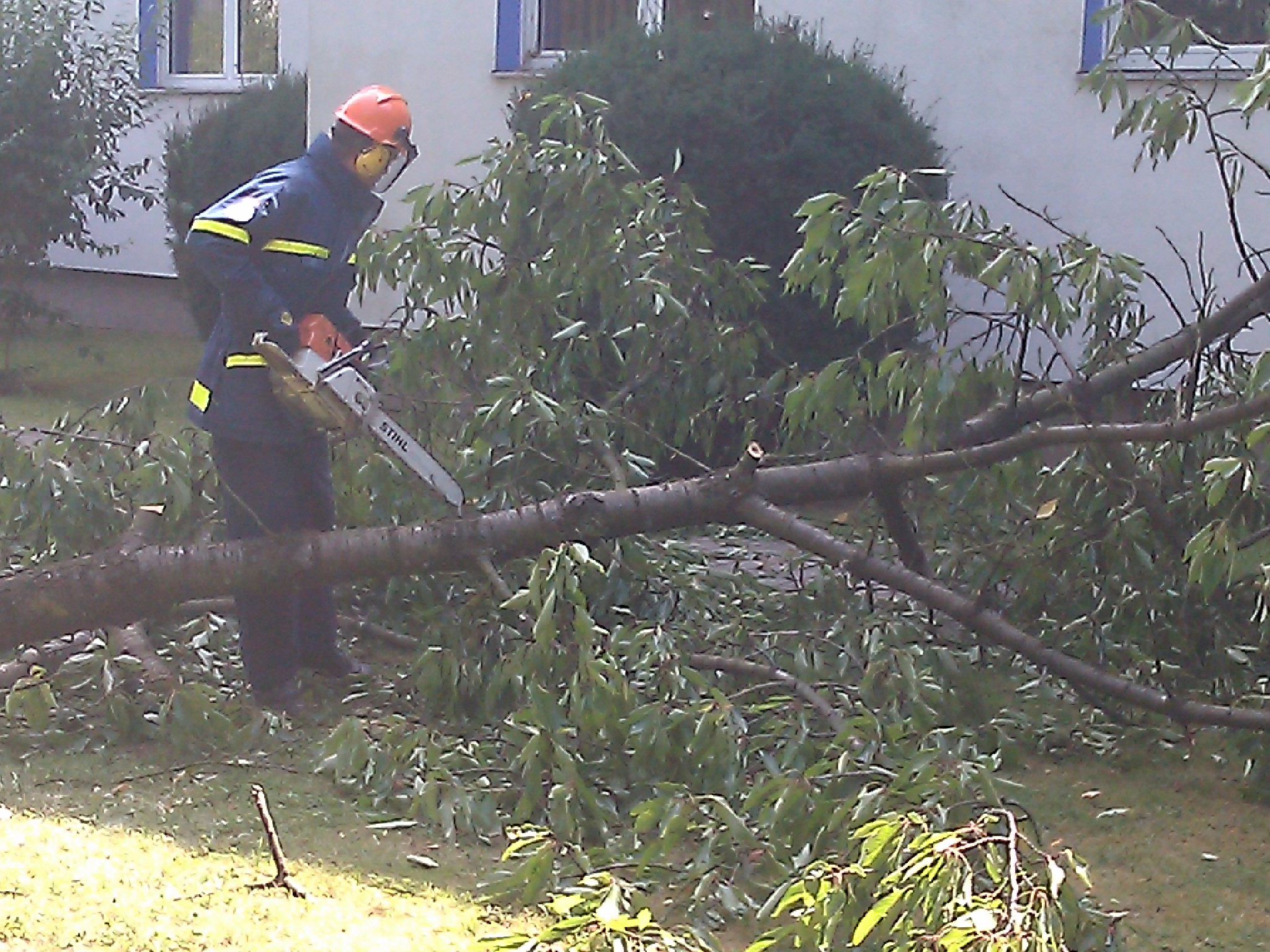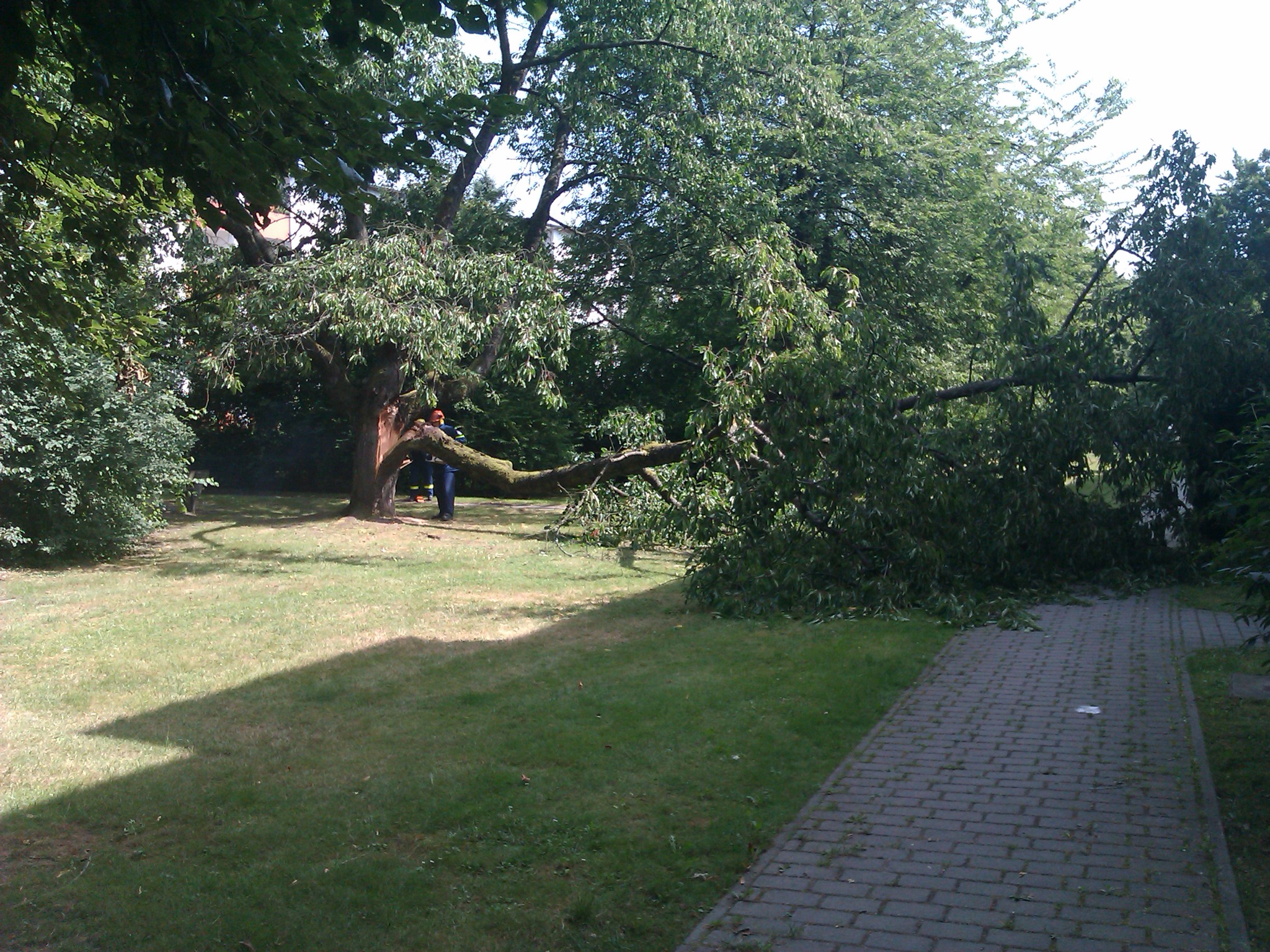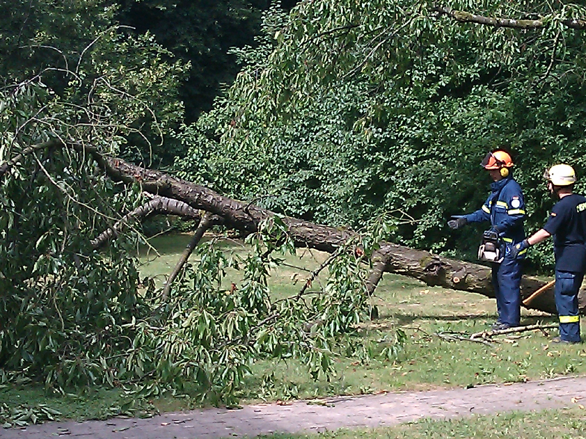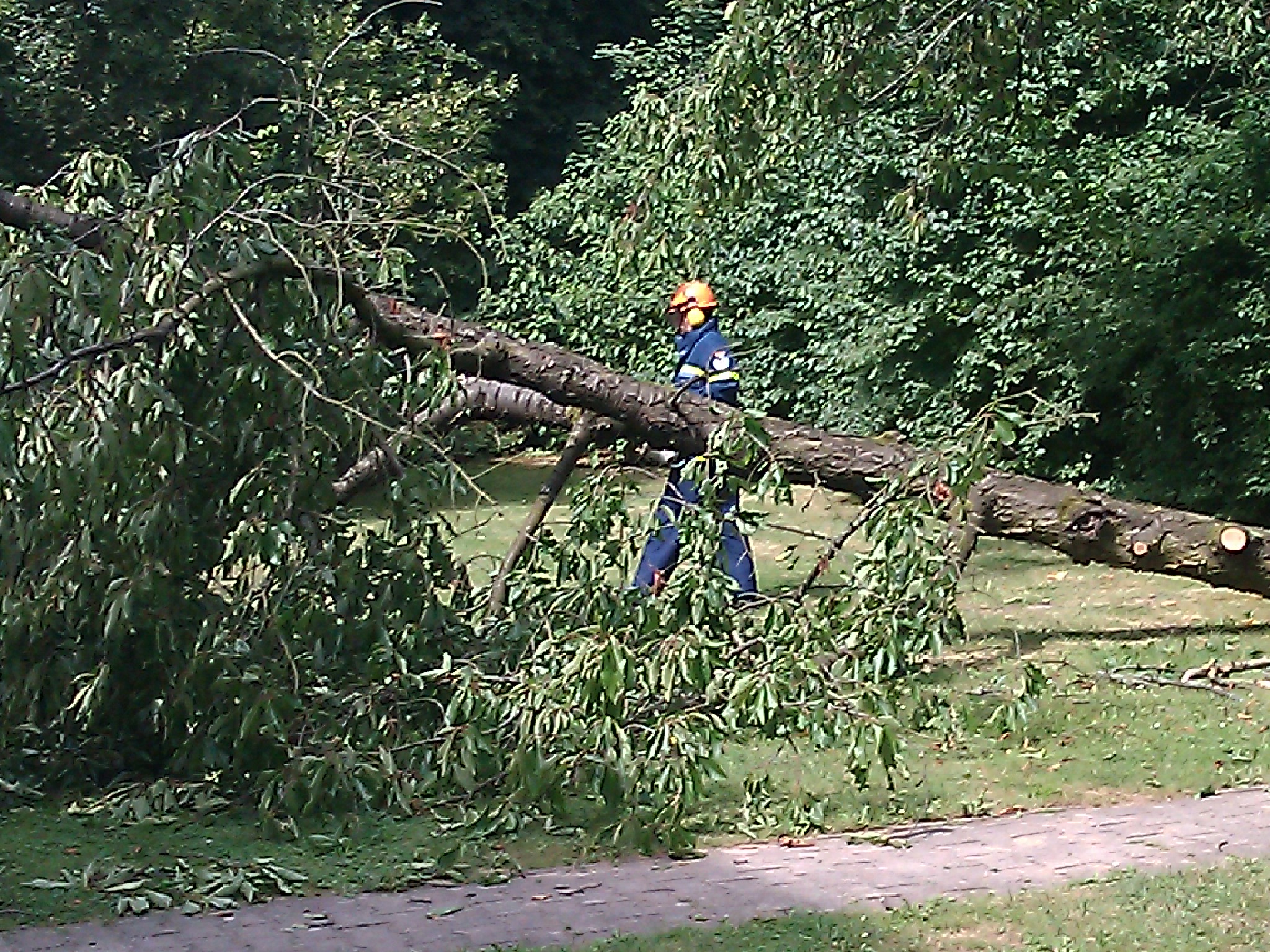 „Ast auf Gehweg“: hier versperrte ein großer Ast, der in der Nacht abgebrochen war den sicheren Zugang zu einem Hauseingang und einem Spielplatz. Der Baum wurde mittels Ketten- und Bügelsäge zerlegt und beseitigt.
