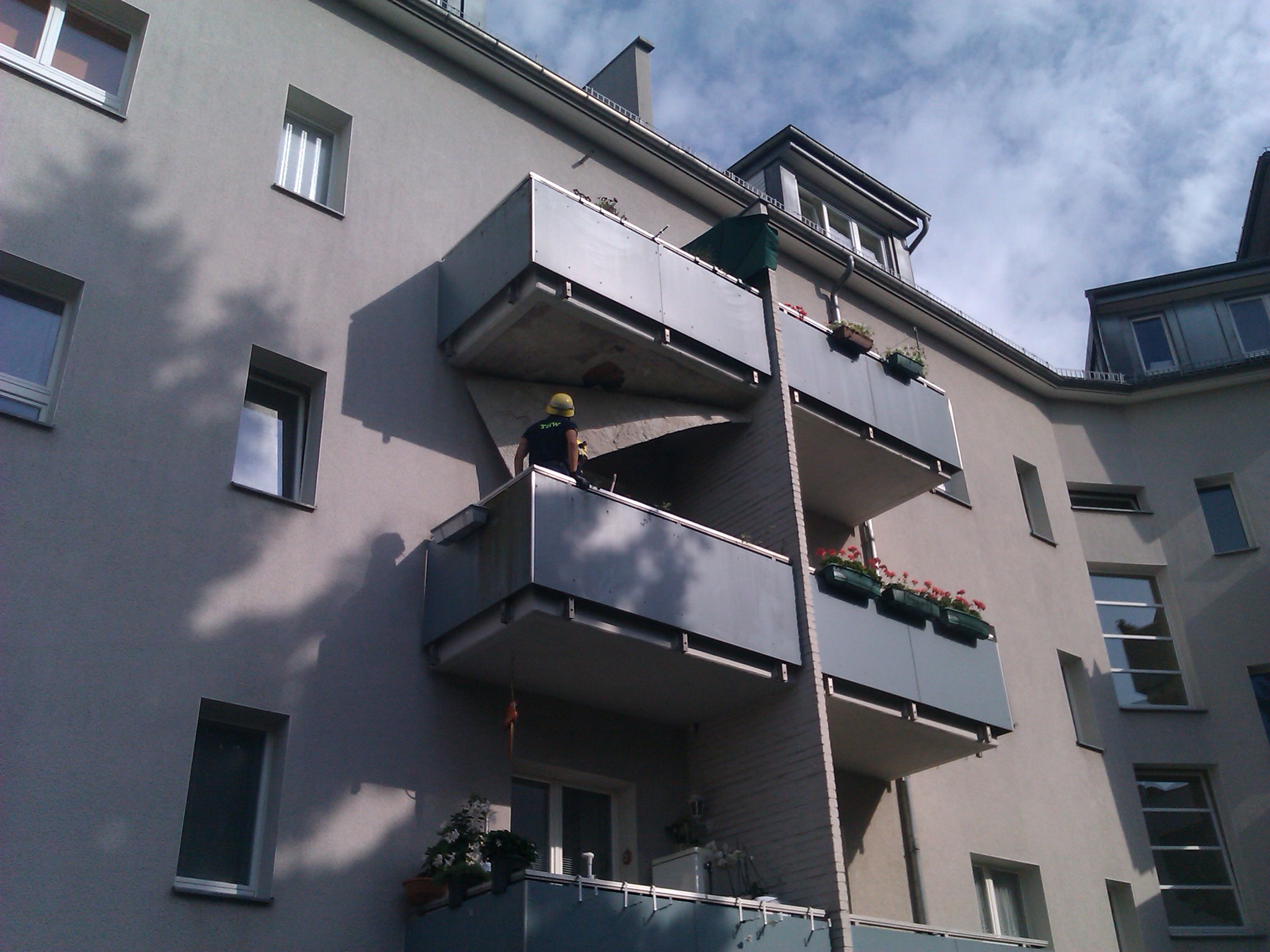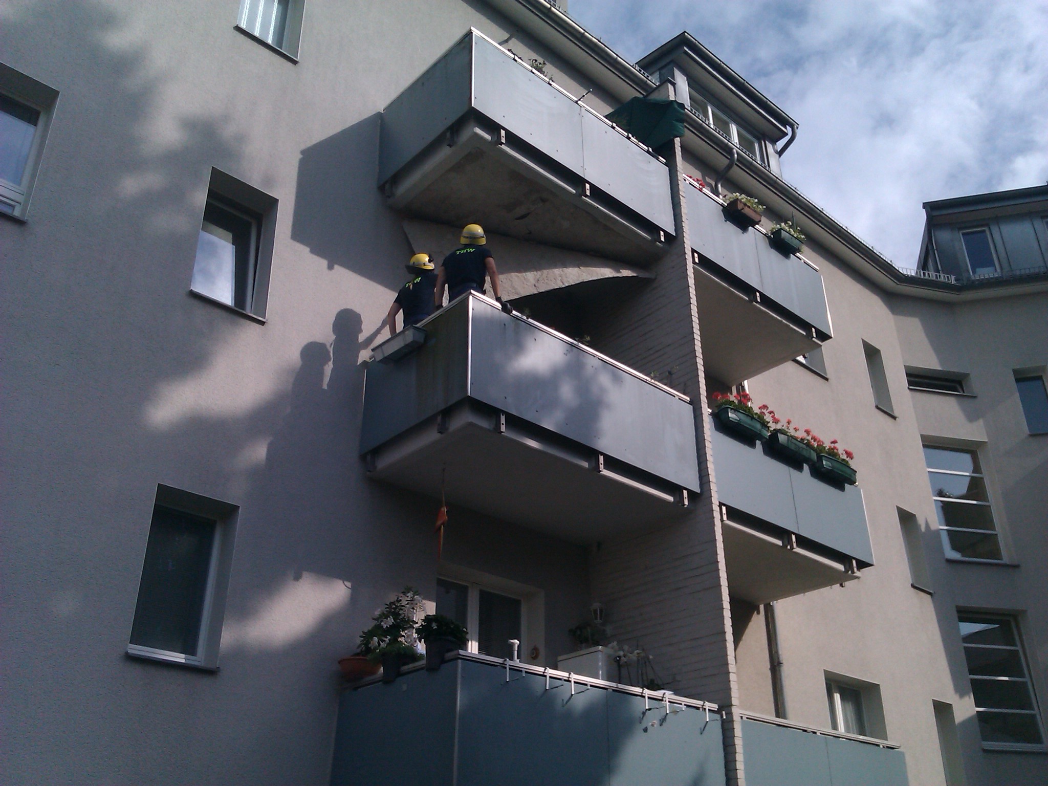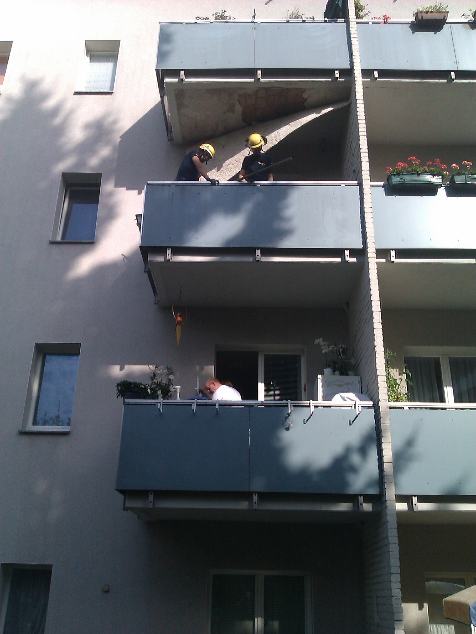 „Droht Putz“: Putz an einem Balkon hatte sich zusammen mit dem kompletten Putzgitter vermutlich in Folge eindringenden Wassers gelöst und gefährdete darunterliegende Balkone. Mittels Einreißhaken wurde loser Putz gelöst und das Gitter abgezogen.