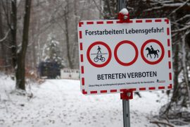 Warnschild „Forstarbeiten Lebensgefahr!“ vor der Einsatzstelle mit THW-Fahrzeug im Hintergrund. Foto: THW / Pablo Grimm